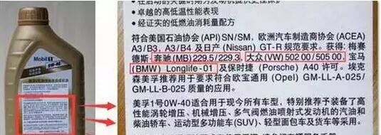 例如大众发动机对机油有自己的一套标准,最低标准是VW502,也就是说至少要满足VW502标准的机油才适合大众发动机使用,往上还有VW503.1、VW504等标准级别,而宝马和奔驰的车型也有各自的机油标准BMW Longlife和MB标准,不同的车型还对应不同的标准级别。满足这些厂家标准的大品牌机油的背面都会写得清清楚楚。