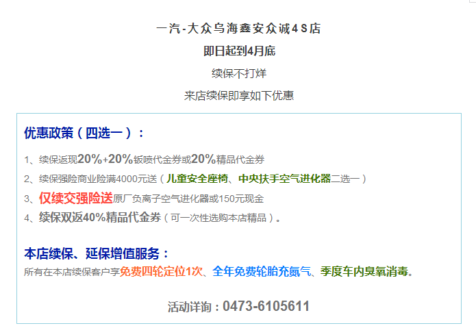 【安心再续 悦享从容】一汽大众乌海鑫安众诚4S店续保巨划算!