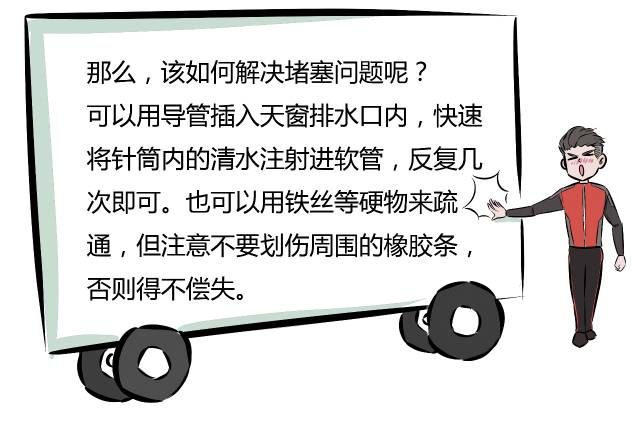 天窗排水孔一般位于天窗的四个角落,下雨天即使关闭天窗,雨水也会沿着导槽从前后排水孔经A、C柱最终由车底排出。如果天窗左右两侧排水孔均被堵塞,积水就会沿着车顶流向车内的天窗电机,一旦使用天窗,往往会造成电路短路烧毁。