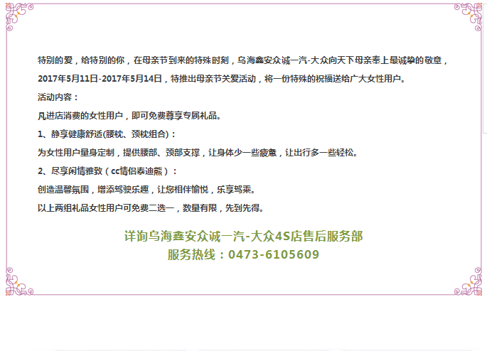 【售后服务】“浓情母爱,感恩常在”乌海鑫安众诚一汽-大众母亲节关爱活动