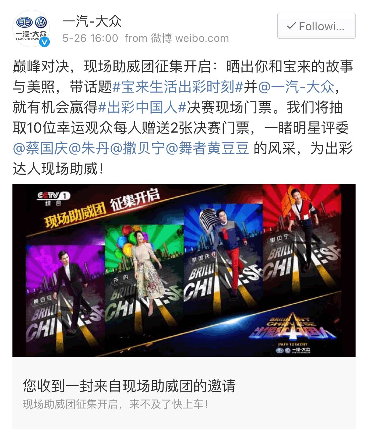 其实我就是想告诉你们,全新宝来独家冠名赞助的《出彩中国人》助威团正在招募中,报名方式就在下方。我不管,这次我愿意去当圈粉的配角,愿意做最嫩的绿叶为这群有梦的“出彩中国人”喝彩(谁去谁也一样出彩。