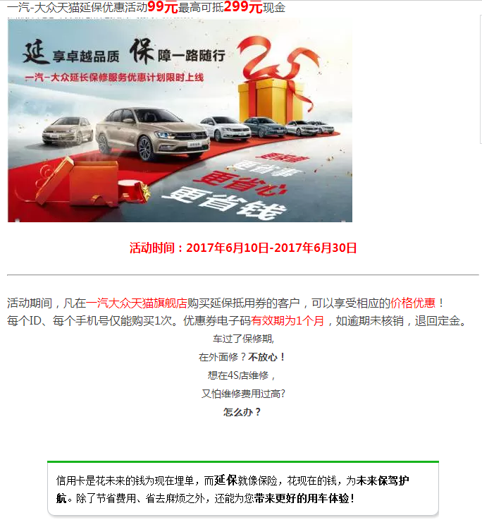一汽-大众天猫延保优惠活动99元最高可抵299元现金