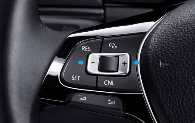 步骤2. 按一下多功能方向盘上的按钮 +或—巡航车速提高或降低10 km/h,并储存当前巡航车速;