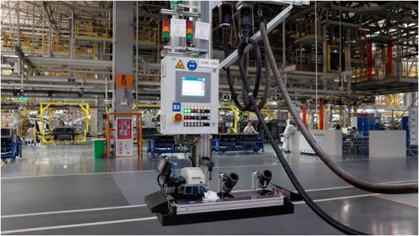 捷达的前端总成在装配时,水箱散热器、防撞梁等零部件首先被组装成前端总成,然后悬挂吊具把前段总成移动到车身处进行整体装车,各零部件之间相对位置精准,连接强度更高,长时间使用也不会出现错位、松动。