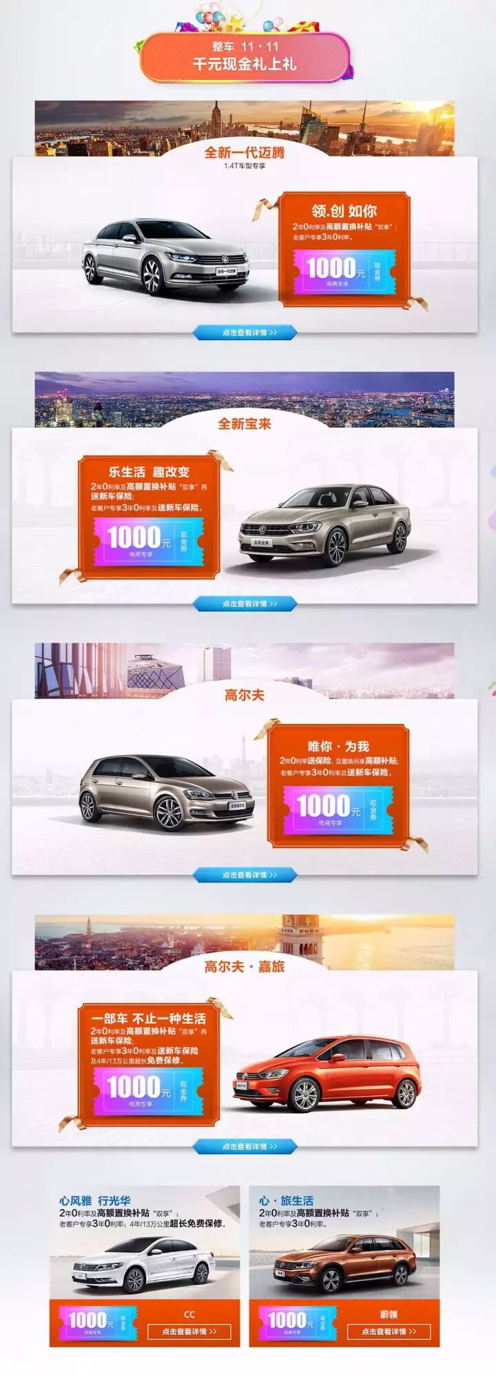 活动车型:宝来(全系)、蔚领(全系)、高尔夫 A7(全系)、嘉旅(全系) 全新一代迈腾(1.4T车型)、CC(全系)