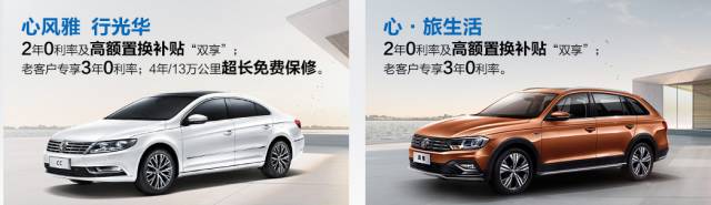 比如:购全新宝来,2年0利率及高额置换补贴“双享”,再送新车保险,老客户专享3年0利率及送新车保险。
