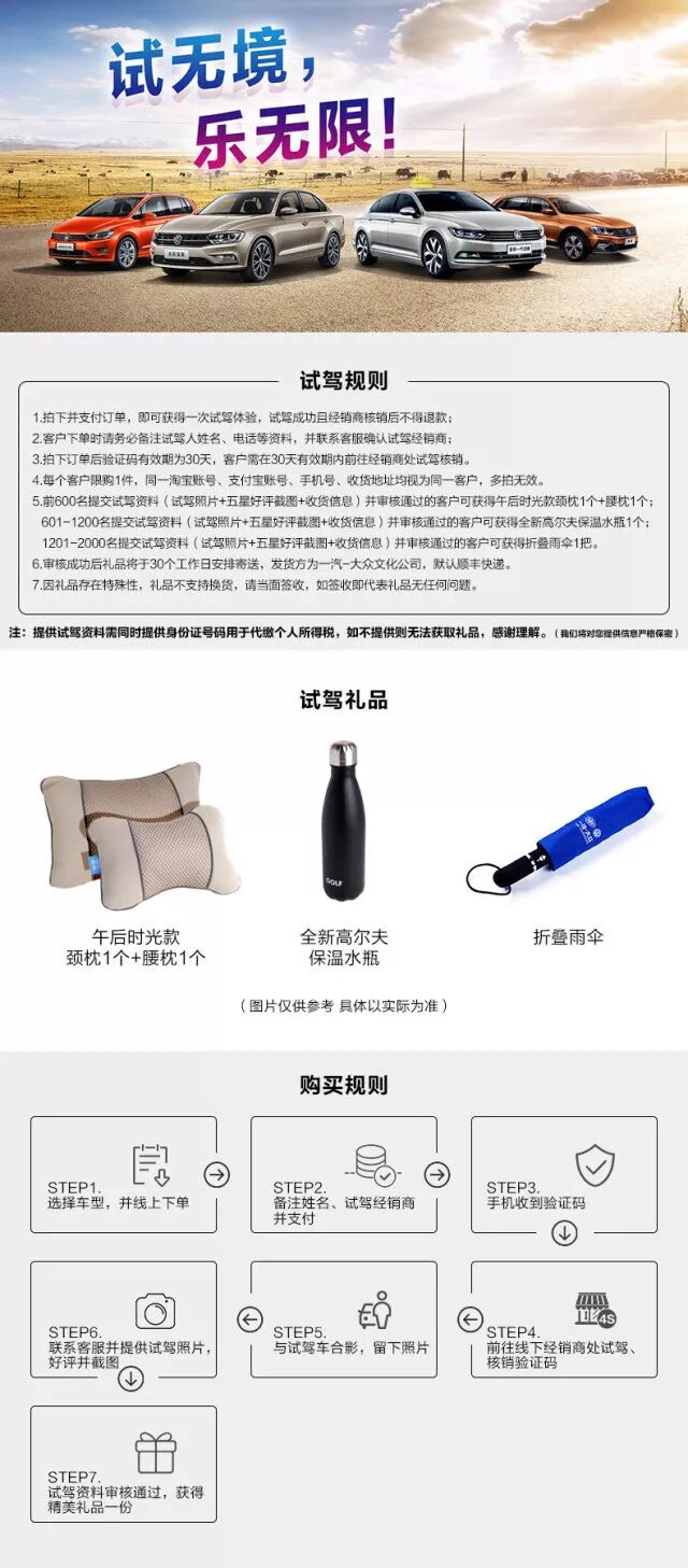 试无境,乐无限,乌海鑫安众诚一汽-大众1元试驾活动上线啦。即日起至11月30日,登录天猫一汽-大众汽车大众品牌官方旗舰店,选择爱车1元试驾,赢取一汽-大众新高尔夫定制水杯、定制折叠雨伞等好礼!