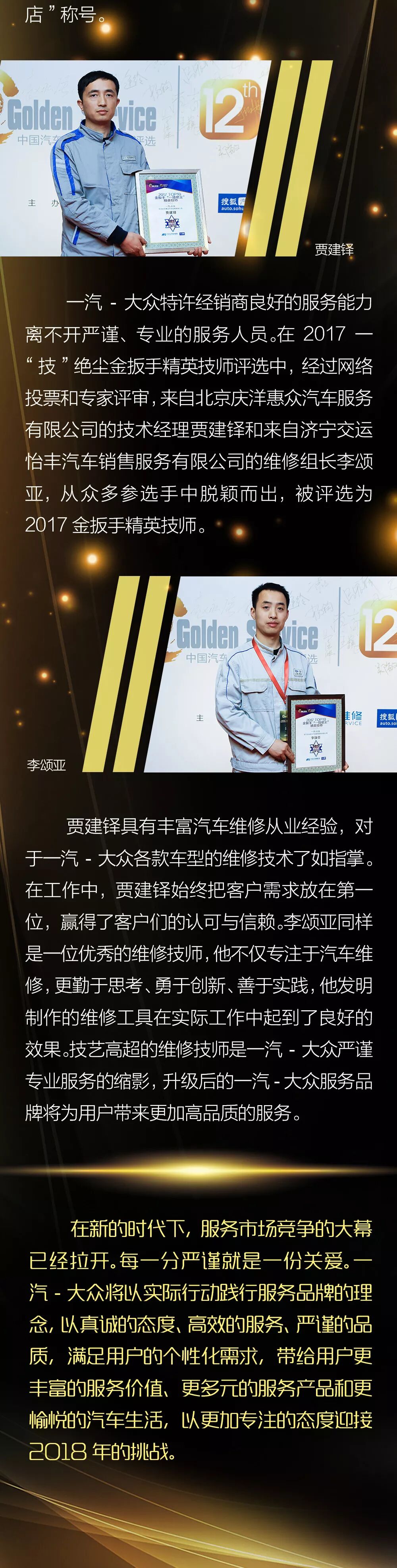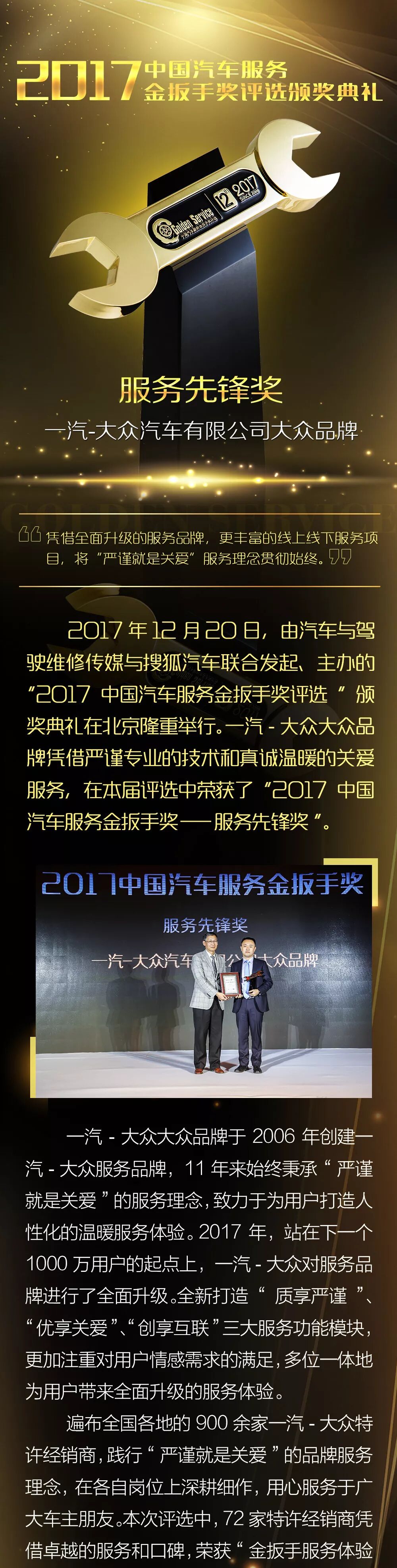 一汽-大众大众品牌荣获“2017中国汽车服务金扳手奖”!