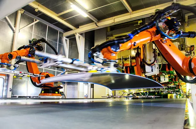 整个车间共有28类单机自动设备,其中整车风挡安装采用德国KUKA公司最新一代七轴机器人,依据风挡轨迹自动行走并实时监控粘胶轨迹、胶量、胶型,重复精确度小于0.05毫米,有效提升工作效率并保障粘接质量。
