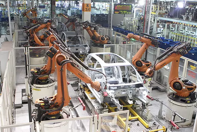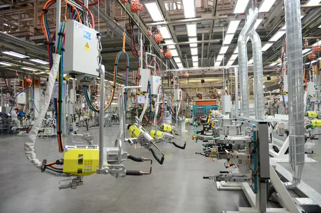 车间大量采用激光焊、激光钎焊、等离子钎焊及中频焊接等先进技术,机器人数量超过800台,远远多于每班的工人数量,自动化率超过70%,整线设计能力为每小时60台。主焊生产线采用三个康采恩框架,具有通过四种车型的柔性生产能力,手动焊钳为一体化焊钳,节能环保。