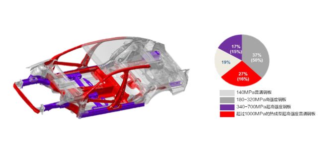整车采用同级最多的热成型钢以及大量的高强度、超高强度钢材。热成型钢板应用区域为车辆正面及侧面碰撞时主要的受力区,它们将与车身上的碰撞吸能区域一同保证乘员区在碰撞过程中的完整,将车内成员受到伤害的可能降到最低。