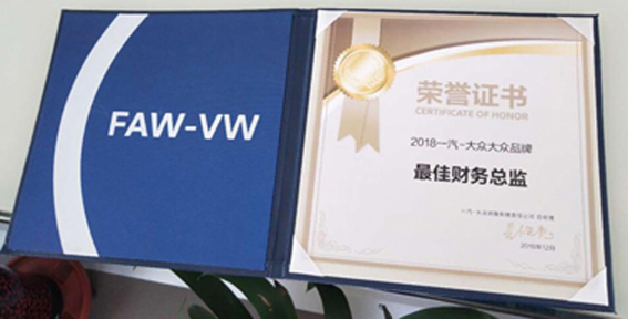 付出就有回报,厂家的荣誉是对日常工作最大的认可;财务总监郭小慧荣获2018一汽-大众大众品牌最佳财务总监!