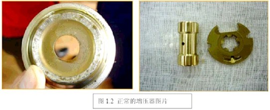 涡轮增压器的工作温度高达900到1000℃,这样高的工作温度就对增压器的冷却和润滑提出了更高的要求。如果机油的热量得不到及时地散发,在增压器叶轮轴的密封环和径向轴承处会形成结焦或积炭(如图1.1)。结焦和积炭会破坏密封和润滑,润滑受到破坏后会加大磨损,进一步破坏密封,最终导致漏油的发生或引起异响,严重的甚至会发生卡滞。图1.2为正常涡轮增压器图片。因此装有涡轮增压器车辆在高速行驶后,不要立即关闭发动机,应让发动机怠速运转5-8分钟。