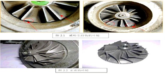 涡轮增压器除了工作温度高外,其工作转速也非常高,全负荷工作状态下其转速可达每分钟18到20万转。高速运转的叶轮轴对动平衡要求非常高,如果没有按车辆保养要求对车辆进行定期保养,不及时更换空气滤清器,会使空气中的粉尘和微粒进入进气道,将进气增压轮片打伤磨损(如图2.1),破坏动平衡,致使磨损增大,导致漏油和异响。图2.2是正常的涡轮增压器叶轮。另外空气滤清器堵塞会造成涡轮增压器进气端压力不足,这样就会引起进气端与排气端压力不平衡,增大磨损。正常工作情况,进气端和排气端的空气压力大于密封腔内机油压力,但当进气压力不足时机油压力就会高于进气端的压力,将机油从密封腔中抽出。所以按保养要求定期更换空气滤清器是非常重要的。