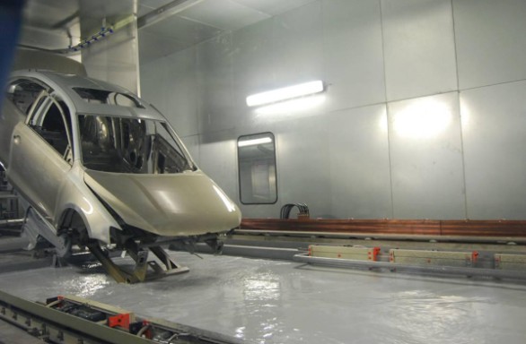 经过焊装车间,全新速腾的白车身已经形成,进入涂装车间首先要接受“洗尘”,在ABB开发的传送链上,进入一个大“水池”,车身要在这个“水池”中做一个360度翻转,以确保车身表面全部“洗”到,洗去车身的杂质,去掉金属表面的氧化点,全面提高车身的防腐能力,为“盛装”做好准备。