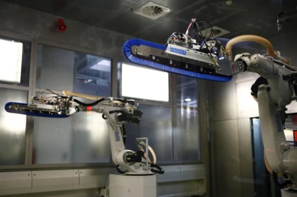 在一汽-大众轿车三厂的涂装车间里,全新速腾的车身喷涂全部由机器人完成。对于参观过很多工厂的记者来说,能使用机器人喷涂车身内表面的车间还是非常少见的。在喷涂线上,开关车门,车身擦净等一些看似简单但是要求走位很准确的工作都由计算机控制的机器人来完成,让我对全新速腾的漆面质量深信不疑。