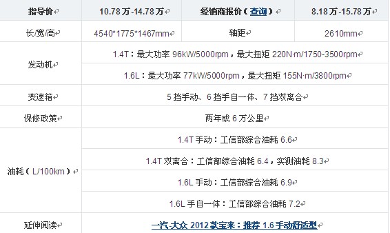在动力方面,宝来2012款继续沿用了EA111系列的1.6L和1.4TSI发动机,搭配5速手动、6速Tiptronic手自一体或7速DSG双离合自动变速器。其中TSI+DSG的动力组合,在具有强大动力的同时又兼顾良好的燃油经济性。宝来的创新之处不仅在于外观的重新设计,而且并不单纯搭载大众入门的1.6L发动机,而是非常合理的引进了1.4TSI+7速DSG双离合的黄金组合,使得消费者在选购宝来时有了更多的考虑空间。