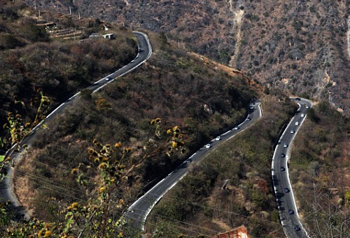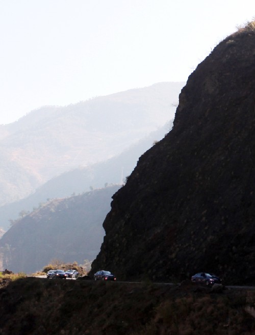 通往丽江的途中,车队排列整齐,从容应对连续的“S”型急弯。