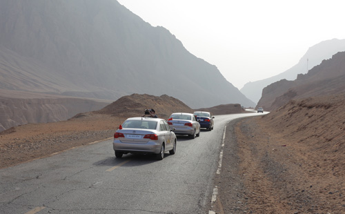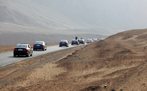 途中一个重要的停靠站便是吐鲁番最著名的景点——火焰山。火焰山地处新疆吐鲁番盆地的北部边缘,是古丝绸之路的北道。火焰山有其独特的自然面貌,再加上神话故事与火焰山的结合,进一步使得火焰山的神奇色彩浓郁,成为天下奇山。当全新捷达车队驶入火焰山的时候,现代化的“创新”走入了神奇,令异域风情更显独特。