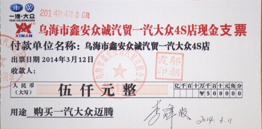 活动内容:2014年3月15日-3月21日期间,无论你在一汽大众店内展厅实际洽谈价格是多少,拿出您的现金支票,付款时均可直接当做伍仟元现金购车使用。