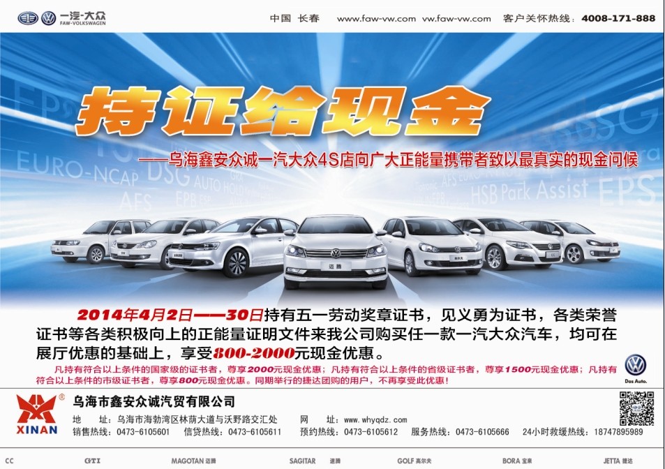 2014年4月2日--4月30日持有无一劳动奖章证书,见义勇为证书,各类荣誉证书等等各类积极向上的正能量证明文件来我公司购买任一款一汽大众汽车,均可在展厅优惠的基础上,享受800--2000元现金优惠。